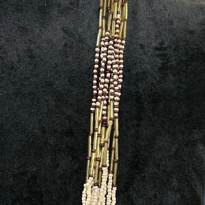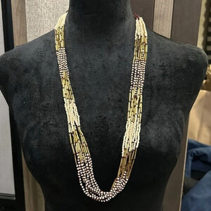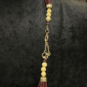Multi Strand Red, Cream and Gold beaded necklace. Adjustable length with metal clasp closure. Length approximately 32”