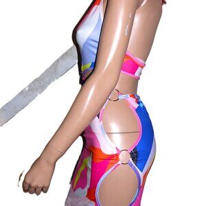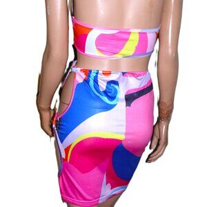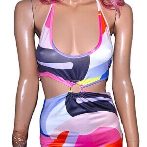 You are viewing a cute bodycon dress no tags Sz S, Multi color, Polyester/spandex, Halter, Measurements were made with the garment lying flat unstretched bust 26", waist 22", neck to hem 39". Dress in excellent condition.