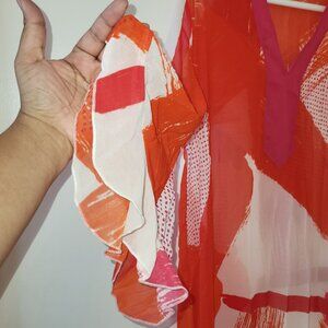 Multi color Red Print Long sheer Beach Kaftan Dress NWOT