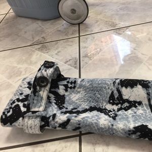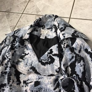 It is in great condition. No button except two on each wrist colar. Length : 38.5 inches, Sleeve : 24.5 inches. Color are blue grey, black and white. There are 2 fake pockets, and a bell with same colors and material with the coat...
