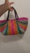 Colorful cornhusk woven bag. Approximately 16” x 8” x 6”. Bag is lined with pink fabric. It’s sure to complete your summer or vacation look. Colors are pink, orange, teal, light aqua and tan