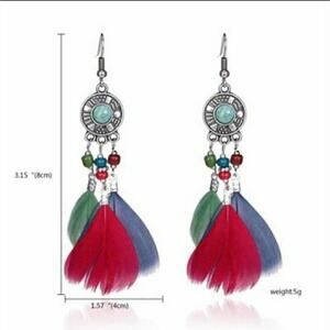 Round silver charm accented with turquoise stone. Brown, blue, green, red beads and blue, red, green feathers dangle below. Silver colored hardware.