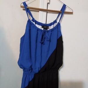 Multi colored maxi dress, 100 % poly and has a lining. no pockets.