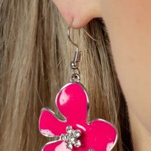 Painted in vivacious shades of blue, pink, purple, and yellow, a collection of colorful and plain silver floral-shaped frames bloom below the collar in three vivacious rows. Dainty white rhinestones dot the center of each flower, for a shimmery finish. Features an adjustable clasp closure. Includes one pair of matching earrings.