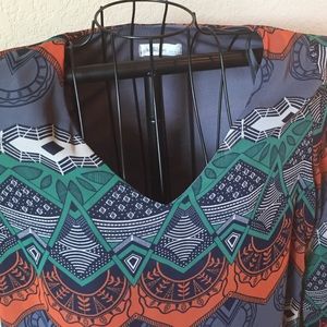 Perfect fall dress! The colors scream fall! Perfect with a tan or brown boot! Flattering a line design with a v neckline. Gathered around the wrists for an extra feminine look. Sheer dress with solid built in underlay. Never worn!