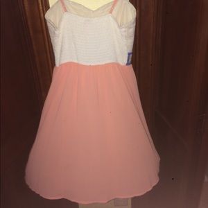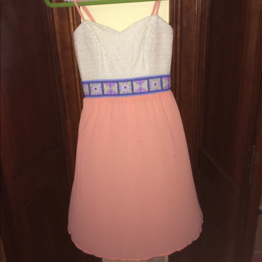 Chiffon and lace dress including both pink and cream section along with a patterned waistband