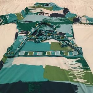 The color are a mixture of dark green, light green, dark blue, baby blue, and white. There is a small stain shown in picture #2 but should be easy to wash out and you can barely see it. It I also a small, and there is a tie up in the back of the dress