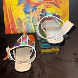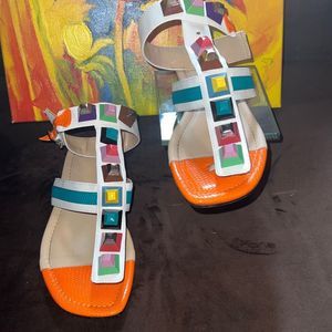 Multi colored leather sandals with ankle straps and pyramid like adornments. Size 8