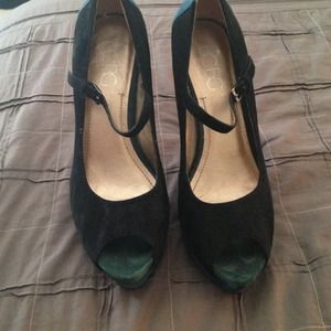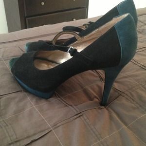 5 1/2 inch heel with a beautiful dark blue suede on platform and heel. The black suede throughout is in great condition on this peep toe shoe. Only wore once. Just made me a little bit too tall next to my man!