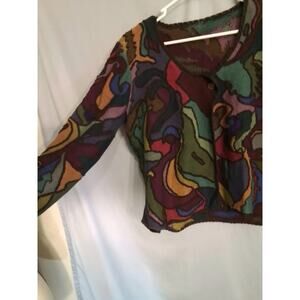 Multi colored sweater/jacket. Warm and cozy heavy knit with mosaic print and one button at neck. Pit to Pit 20", Sleeve 22", Length 21". No tags Size L from measurements.