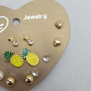 These adorable earrings come in a multi pack with a pinnaple earring, pearl earring, gold ball earring, diamond earring, gold heart earring, square earring, and a flower with a diamond earring.