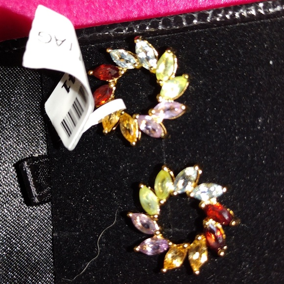 Gold Coast brand. 14 karat gold-plated post earrings. Done in a circular design with marquis shaped stones, all semi-precious gemstones. Garnets, amethyst, blue topaz, to name a few. new with tag. Comes in a beautiful black snakeskin looking box with velveteen pad for the earrings. We are a non-smoking household, but are pet friendly.