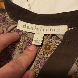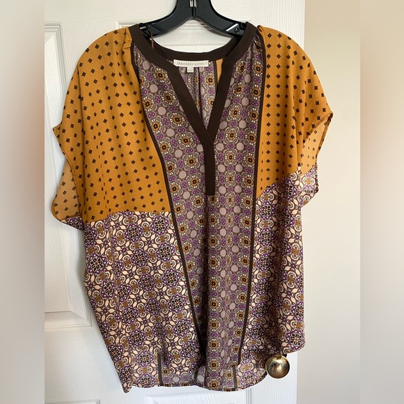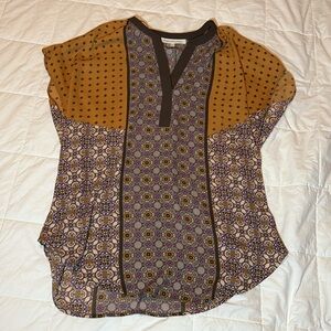 Multi pattern round, purple and tan women’s top cute sleeves. Gently preowned. 100% polyester. top to bottom 20 inches on the sides, and 29 inches in the center. length from Pit to pit is 24 inches