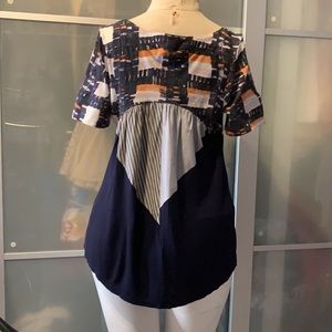 Blue, white and orange, multi patterned high low tee. Has dress shirt material mid back. Lower back gathers like a tail and provides backside coverage. Great for looking stylish and running out for coffee/errands.
