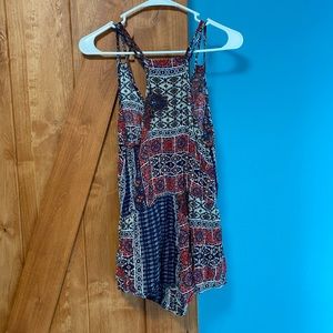 Worn twice. Multi pattern spaghetti strap romper. No pockets but free and flowy. Great for a fall event- pairs great with a Jean jacket.