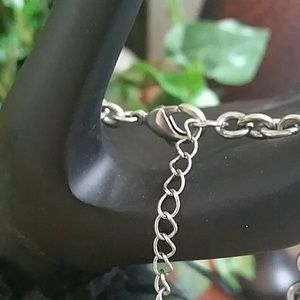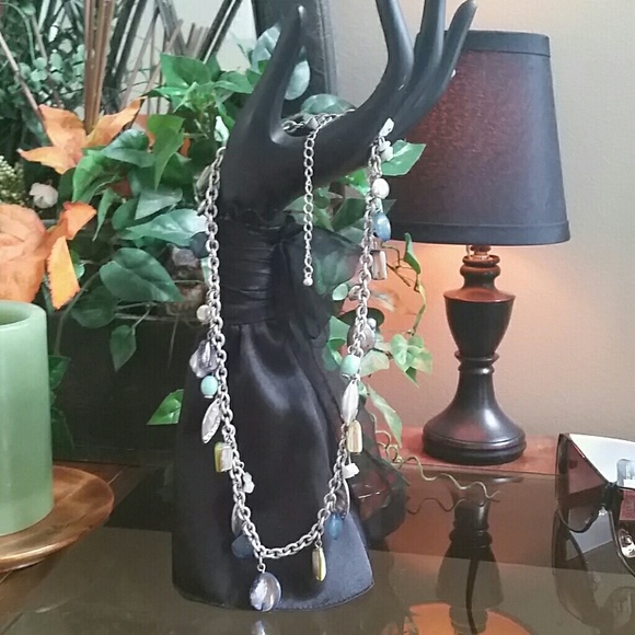 Reminds me of water or the river. Silver tone almost pewter looking chain linked neckless with turquoise, blue and green stones hanging from chain links. Clasp hook closure. There is a bracelet that matches this piece. Buy both and get $5 off. Just ask before buying and I'll change the price.