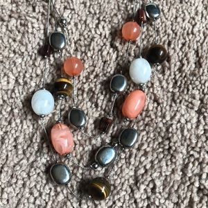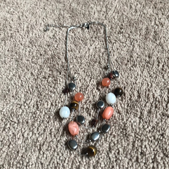 Multi string necklace with silver, brown, white and peach beads.