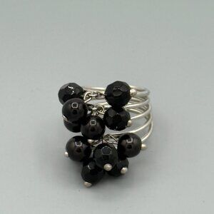 This multi-band silver ring showcases a striking cluster of black beads, providing an elegant addition to both casual and formal attire. The combination of polished silver and faceted black beads creates a sophisticated contrast, enhancing its appeal. The ring's unique design makes it a standout accessory, suitable for a refined look.
