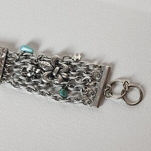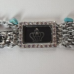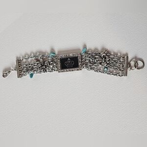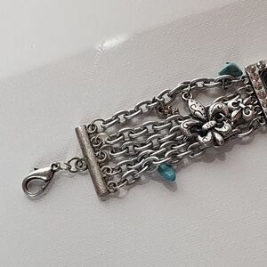 Multi-Chain Silver Statement Bracelet Rhinestone Crown Turquoise Charms Boho 8"