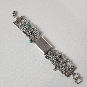 Add a bold, eclectic flair to your jewelry collection with this stunning multi-chain silver-tone statement bracelet. Featuring a layered design of thick curb chains accented with small turquoise bead charms and a standout rhinestone-studded crown centerpiece, this bracelet offers a unique blend of boho, vintage, and glam rock aesthetics.