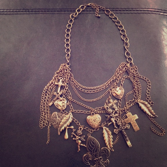 A large fleur de lis charm is surrounded by hearts, cupid crosses and feathers on this antiqued gold statement necklace.