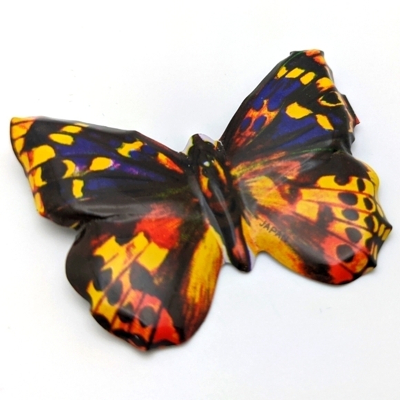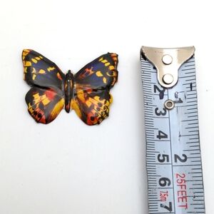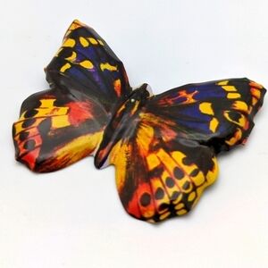 Exquisite life-like butterfly brooch crafted from tin, featuring vibrant shades of yellow, blue, orange, purple, and red.