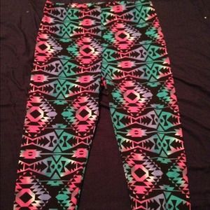 These are white,teal,and fuchsia leggings with black Aztec print on them. They are extremely comfortable! Only been worn once