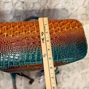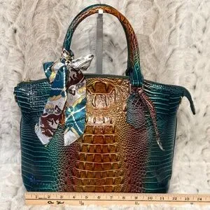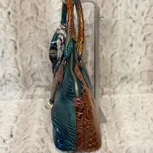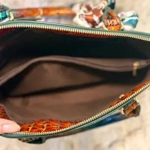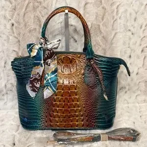 This bag is so pretty. The colors are brown, tan, burgundy, teal, green. It is so unique and beautiful. Lots of room and pockets. Comes with a cross body strap.