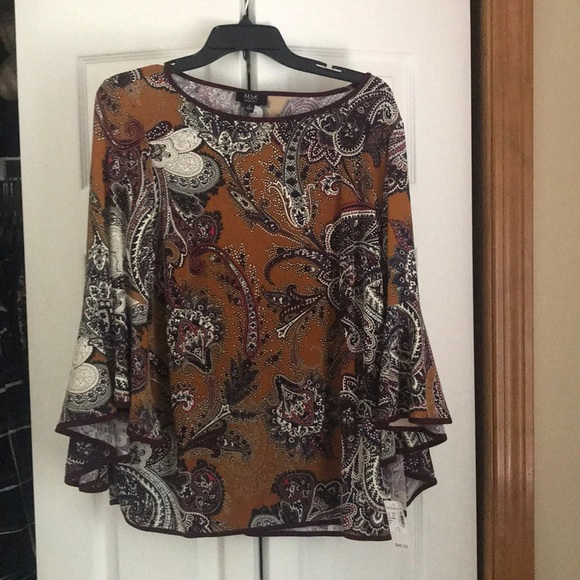 Gold, burgundy and blue top with burgundy piping and flowy sleeves. Brand new from Dress Barn. 1X