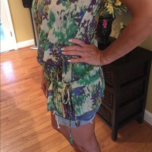 Multi-color blousy tank with tie at side of waist. Dress it up with slacks or a skirt or wear it casual with shorts, jeans, or leggings