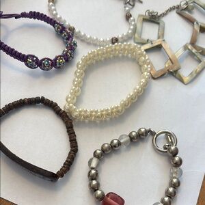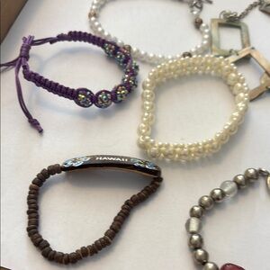 This bracelet set features a variety of colors including purple, silver, and brown. Perfect for adding a touch of elegance to any outfit. From estates may have flaws. Use for craft or wear/sell