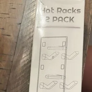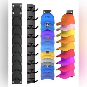 Stylish cap display rack with multiple hooks. Includes caps in various colors: blue, pink, orange, yellow, gray. Perfect for organizing and showcasing your collection. Open but never used and all parts included