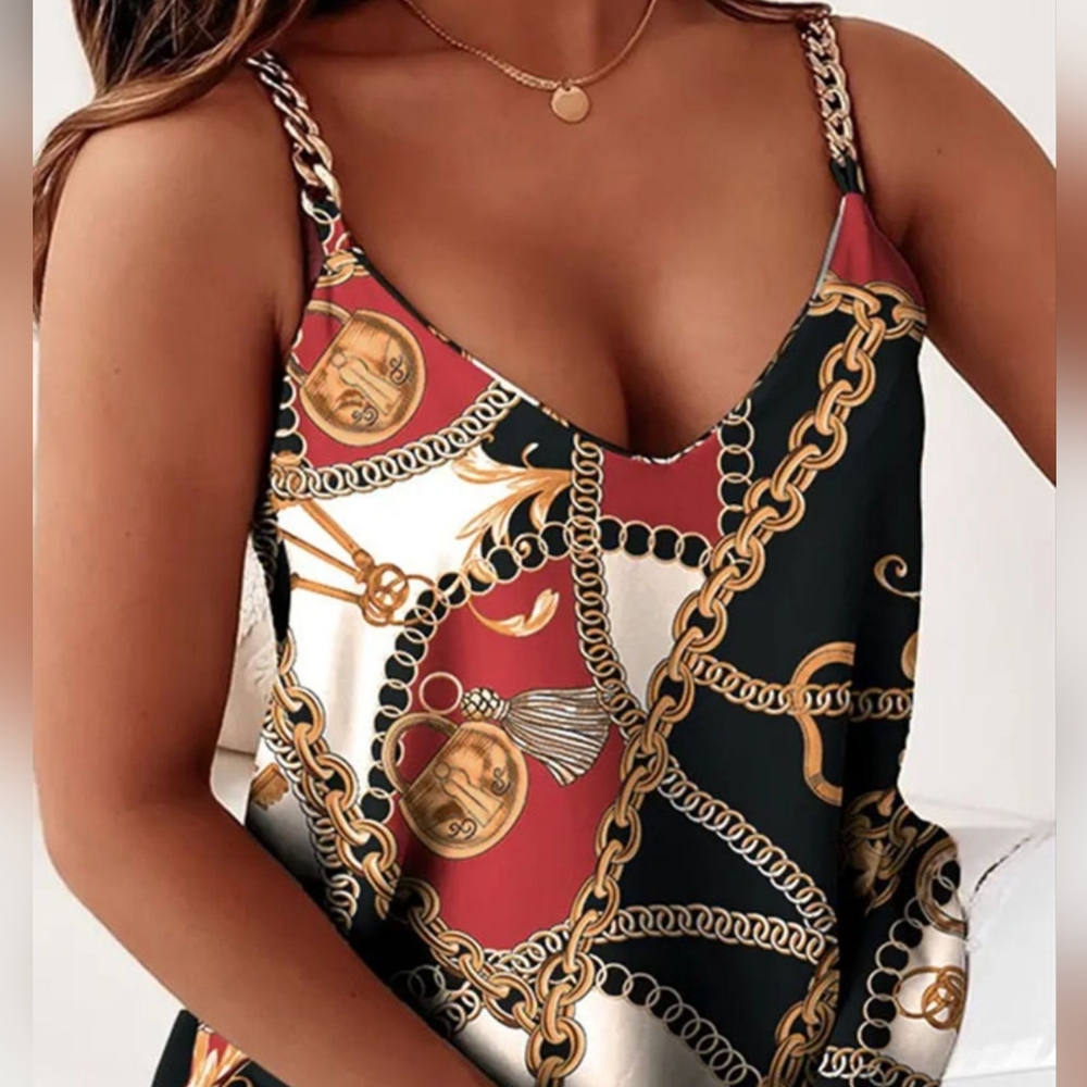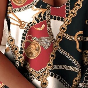 Elevate your style with this chic chain print top. Featuring a striking black, red, and gold design, this top is perfect for any occasion.