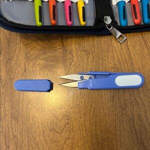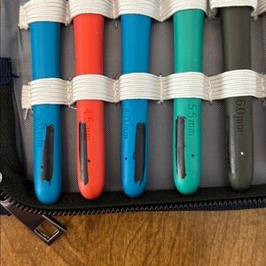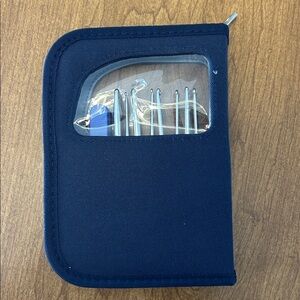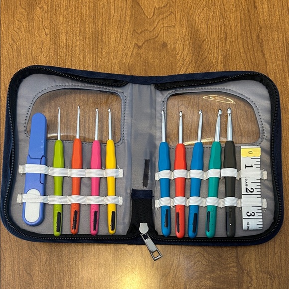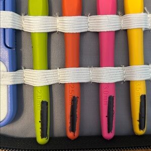 Organize your crochet tools with this vibrant crochet hook set. Featuring a variety of colors, this set is perfect for any crochet enthusiast. The included case keeps everything neatly stored and ready for your next project. The name was blacked out on the hooks & case.