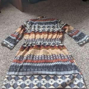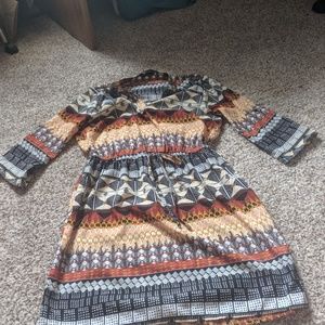 This gorgeous multi-colored, multi-designed dress has only been worn twice. It's somewhat loose fitting & has a belt.