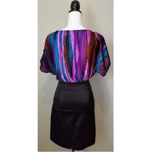 Only worn once! Beautiful satin-like material, with a colorful, almost "painted", design. Loose, dolman-sleeve top and fitted bottom. Zippered side for easy on/off.