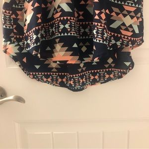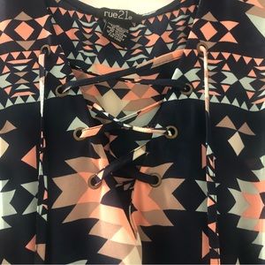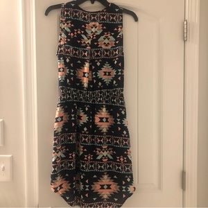Multi-color, Aztec design dress featuring navy, pink, baby blue and gray colors. Front crisscross tie design, elastic waist, and slightly longer in the back. Straps are 2.5 inches wide. Size medium from Rue21.