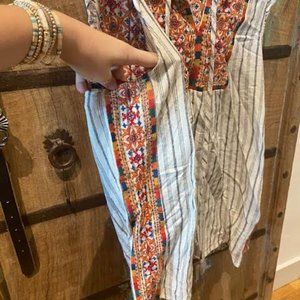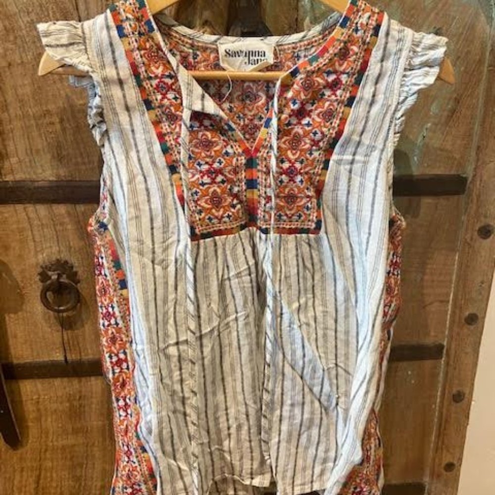 Featuring: ruffle sleeve detail, v-neck, front tassles, embrodiered back & side pannels, multi colored, stripes