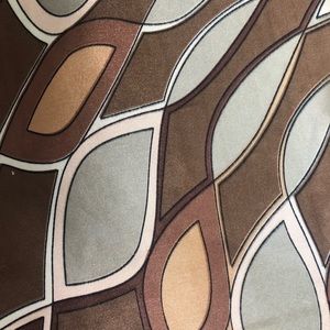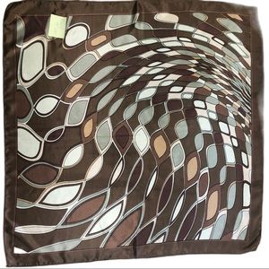 Brown, cream, gray, copper and black, geometric print scarf. Satin-like sheen.