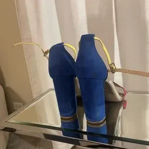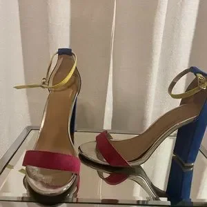 Charlotte Russe multi-colored ankle strap heels. Beautiful show and get many compliments! Slightly worn scuffs on heels and a little lifting of sole. Nothing a little glue can’t fix. Heel height is about 3.5inch.