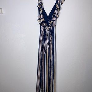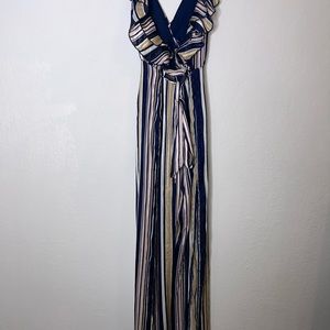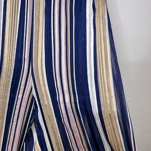 Fashionable and trendy LUXXEL jumpsuit with high leg split on both legs. Sheer with stitched in romper underneath. Perfect for Day or Night Time events.