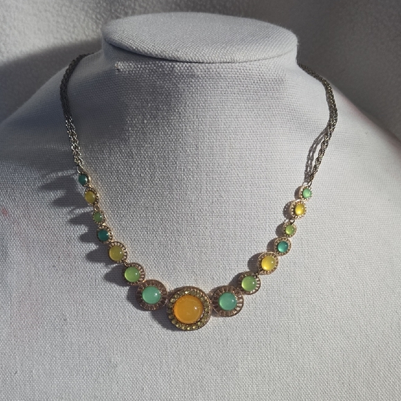 This elegant necklace features a stunning combination of yellow and green stones, perfect for adding a pop of color to any outfit. The intricate design and vibrant hues make it a must-have accessory.