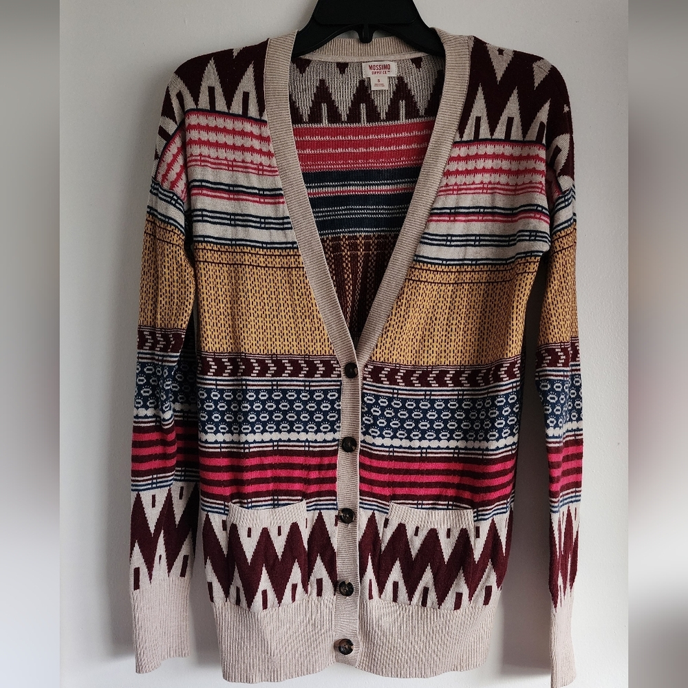 Stylish multi-color patterned V-neck cardigan with button front. Features cream base with maroon, mustard, navy and pink geometric stripes. Soft knit fabric for comfortable all-day wear. Versatile layering piece that pairs well with jeans or skirts.