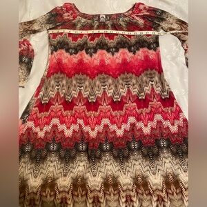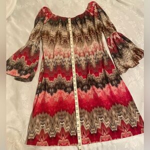 Lightweight printed dress. Soft drape and flowy silhouette. Vibrant pattern with neutral tones. Versatile for casual or dressy looks.