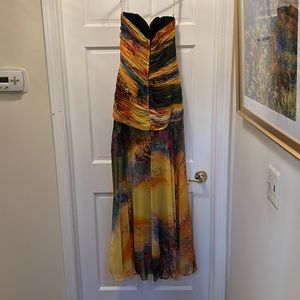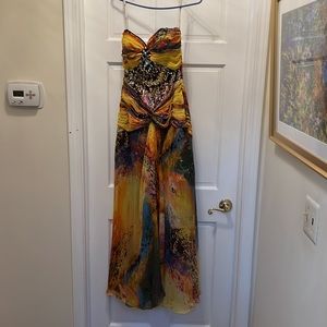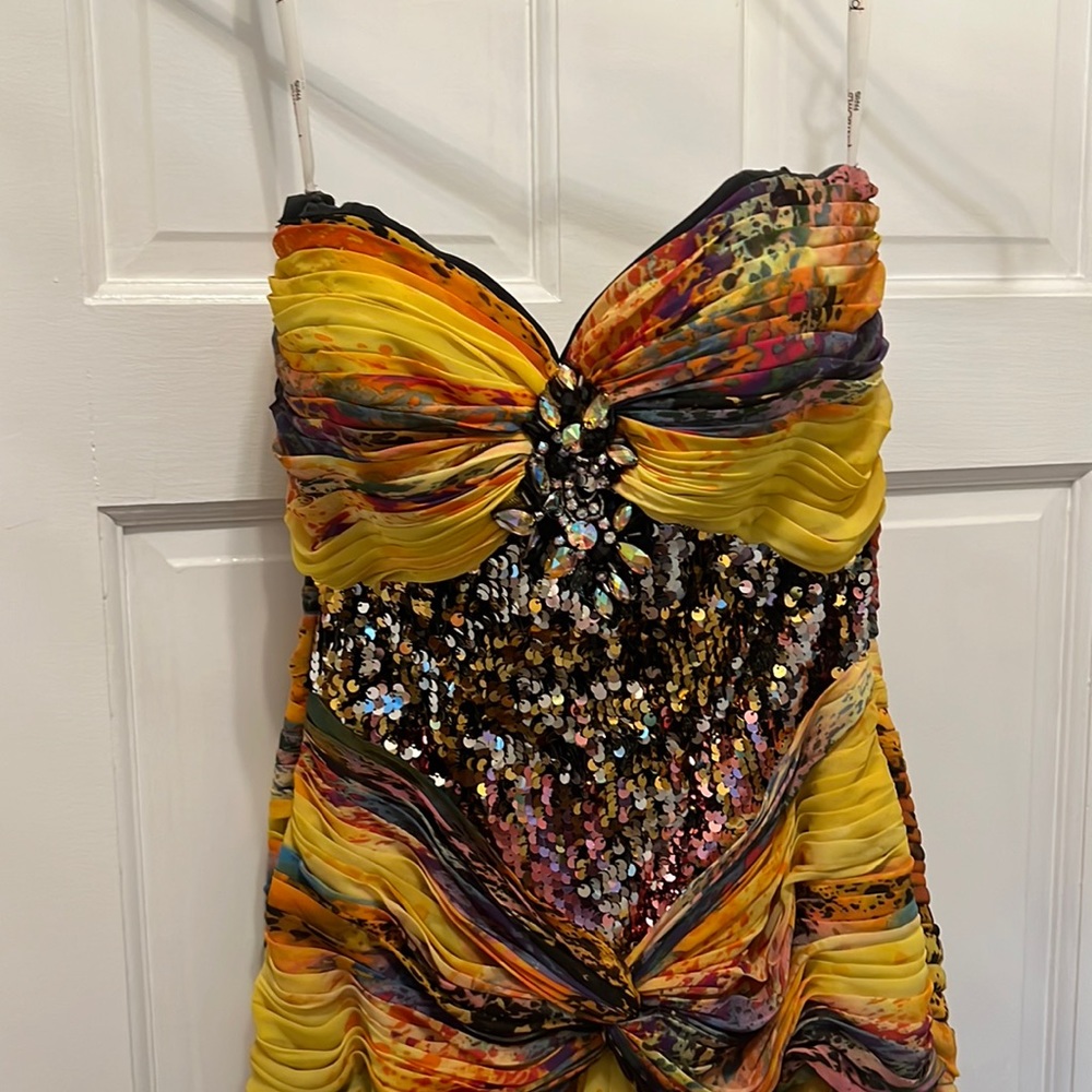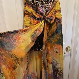 ONLY WORN ONCE! Multi-color with sequencing and matching wrap. Dress is short with long fabric covering legs. Floor length. Built-in padding