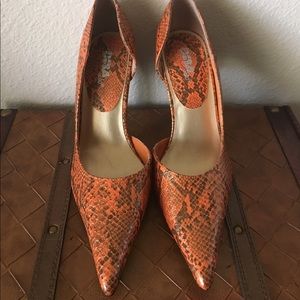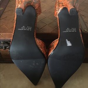 Multicolor pumps are orange and brown faux snake with specs of gold flat glitter. Excellent condition, worn only once or twice. Comes with original shoe box. Please see pictures for verification.