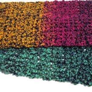 I used a loose knit crochet stitch, the colors are Black, Light and Dark Maroon, Teal, Blue, Yellow, and Gold twisted together and in random color stripes.