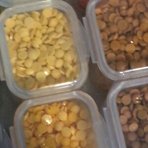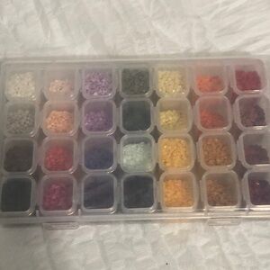 Clear plastic organizer with 28 small compartments. Filled with assorted tiny beads or rhinestones in multiple shades including yellow, orange, red, purple, blue, green, cream, brown and black. Ready for crafts and nail art. Compact and easy to use.
