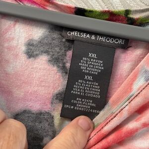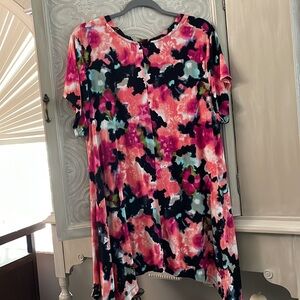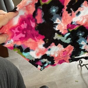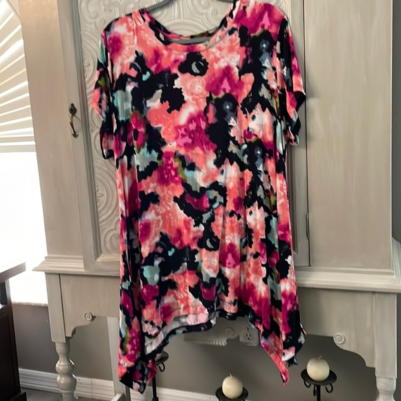 Pink/Black/Orange Cap Sleeve Shark-bite bottom flowy top. 95% Polyester; 5% Spandex, Scoop Neck, EUC