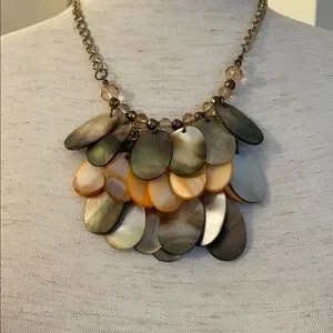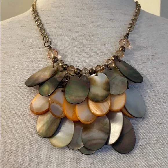 This elegant necklace features a stunning array of multi-color shell pendants, perfect for adding a touch of sophistication to any outfit. The gold chain complements the natural tones beautifully.